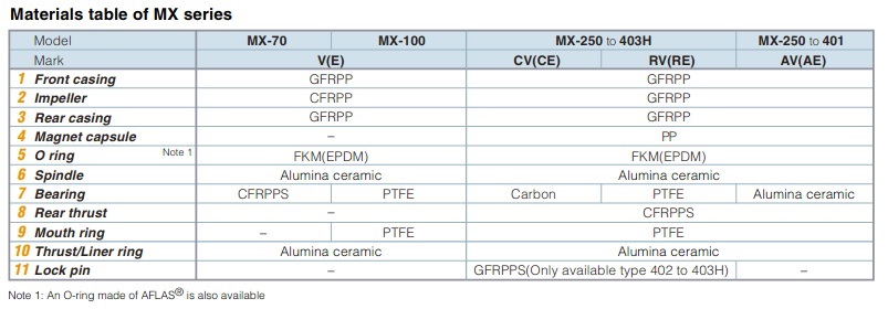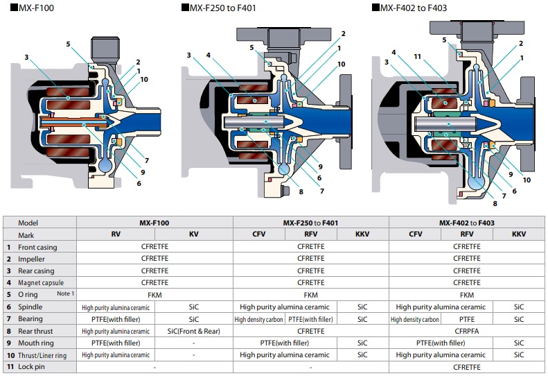 - 수지타입 마그네트 펌프에서는 처음으로 프론트 케이싱과 리어 케이싱에 의한 2분할 식 펌프 케이싱을